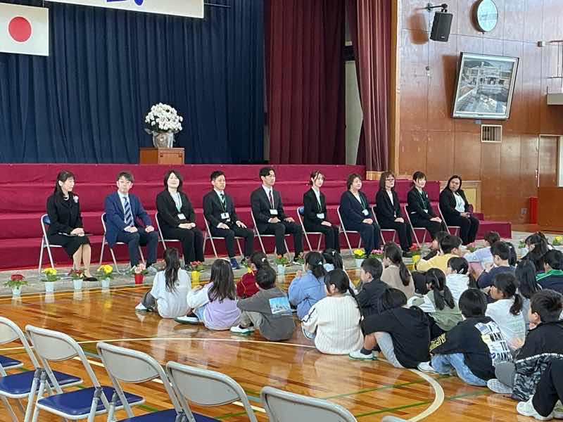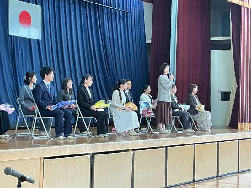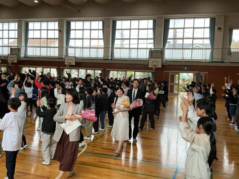 1時間目は、退任式でした。鶴城小学校に昨年度まで勤務されていた先生方が、挨拶に来てくださいました。