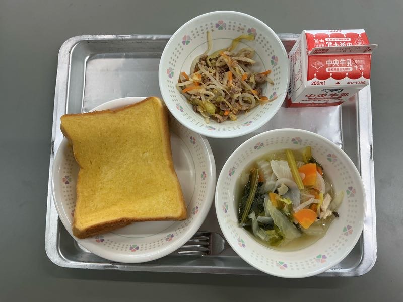 今日の給食はフレンチトーストとスープ、焼肉サラダ、牛乳でした。