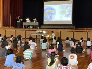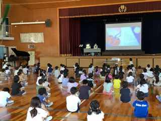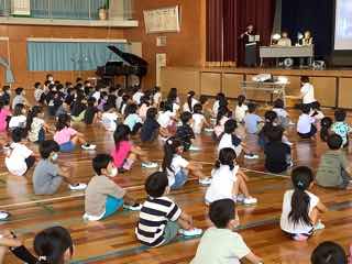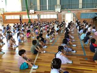 今日は読書集会。体育館で、暑さと密を避けるため、今年は1年生と2年生、6年生が参加しました。3学年を2つに分けて2時間体制で行いました。