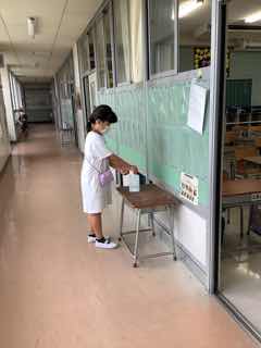 今日の給食風景は、5年1組です。今日の天気は急に変わり、給食準備中は大雨でした。すごい量の雨が降り、すごい音もしていました。でも、教室の中はいたって静かです。さすがです。