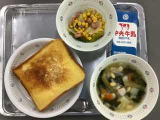 今日のメニューは、アーモンドフレンチトースト、野菜たっぷりスープ、ウインナーとアスパラのソテーです。〇〇トーストは、事前に下味を付けてから焼くので、大変手間がかかります。その分、とっても味わい深いです。