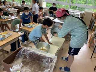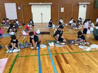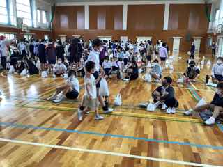 一年生と六年生は、体育館でペア給食です。
