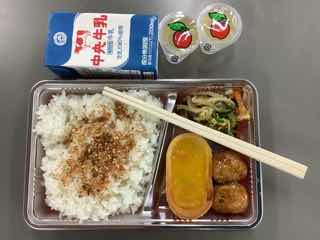 今日は運動会。明日も月曜日も雨予報だったので、本日できるところまで行いました。3時間目の途中から、授業となりましたが、給食は予定通りのピクニック給食です。メニューは、カボチャグラタン、ごぼう入りつくね、もやしの昆布和え、りんごゼリーです。