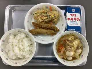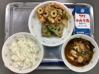 今日のメニューは、新じゃがの味噌汁、はんぺんの磯辺揚げ、タケノコの土佐煮です。旬のタケノコがどっさり入って、さくさくした歯ごたえが抜群です。