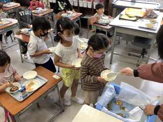 とっても愛嬌のあるかわいい笑顔を見せてくれました。嬉しいなぁ!そして、担任の先生は二刀流の配食技で、ご飯とはんぺんのお代わりに対応していました〜これも、すごいね!