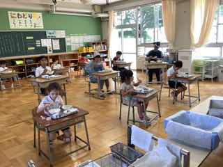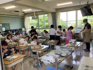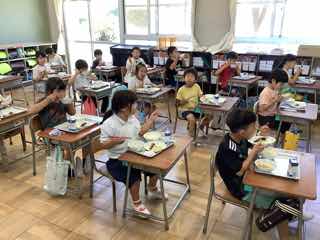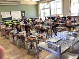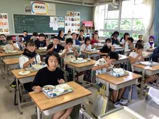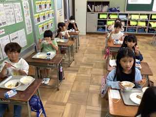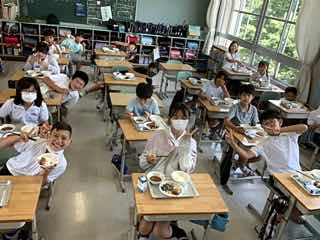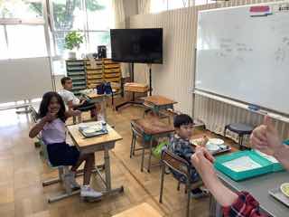 今日は、5の3におじゃましました。おっ!ブログだねといち早く気づいた子が、お椀を持ってスタンバイです。カメラをインカメラに変えて、自分の動きが見えるようにしたら、何だかいつもとひと味違うショットになりました。