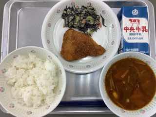 今日のメニューは、カレイフライ、ひじきサラダ、玉ねぎの味噌汁です。今、値段高騰中の玉ねぎがたっぷり入った味噌汁は、赤味噌が効いて食欲が増します。それ以上に、カレイフライにかかっているごまだれの美味しいこと!イカフライのレモン煮と肩を並べる美味しさです。