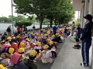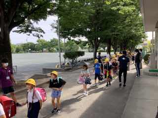 一斉下校では、暑い運動場で並ぶのではなく、学校から遠い班と比較的近い班の2段階に分けて下校しています。2段階下校と呼んでいて、木陰のあるけやきロードに並んでいます。