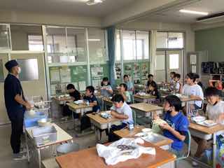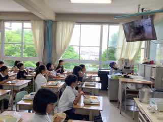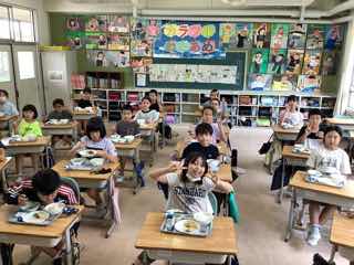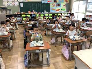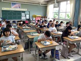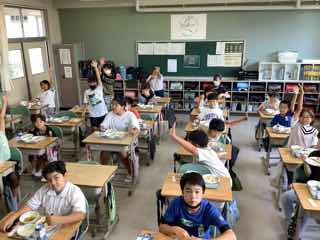 今日は、5の2におじゃましました。ちらし寿司のお代わりをすすめているところでしたが、暑さのためかいつものようには減りません。「あなごのお代わりもあれば」と本音を聞くことができました。確かに!子供たちのお寿司には、すでにあなごの姿はありません。美味しいものね!