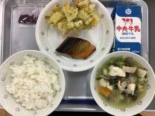 今日のメニューは、サバの照り焼き、青のりポテト、豚しおちゃんこ、しそふりかけです。サバの照り焼きは、皮目もしっかり照りが出ていて、すごく美味しかったです。豚肉がたっぷり入った塩ちゃんこも、具だくさんで大満足!