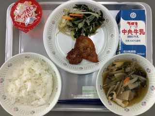 今日のメニューは、豚肉のごまみそ焼き、ワカメと野菜の和え物、のっぺい汁、フルーツ杏仁です。豚肉のごまみそ焼きは、一枚の肉が大きくて見ただけで嬉しくなります。食べて、その美味しさに、またまた嬉しくなりました。今週は、根菜がたくさん入った汁がでるので、いろいろな野菜が食べられます。