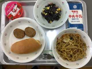 今日のメニューは、焼きそば、小型ロールパン、ひじきサラダ、レバー入り白ゴマつくね、アセロラゼリーです。焼きそばとパン、ダブル炭水化物。でも、この組み合わせのおかげで、焼きそばパンが出来上がります。焼きそばのソースの加減が絶妙です。