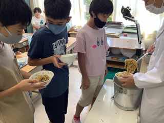 小さい子では、うまく挟まないですが、上手に作っていきます。手慣れてますね〜そして、焼きそばのお代わりは、こんなにもらえています。もともと配食される量も高学年は多くなっています。今日もお腹いっぱいいただきました。