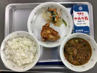 今日のメニューは、鶏肉のアーモンド揚げ、小松菜のナムル、麻婆茄子です。鶏肉のアーモンド揚げは、アーモンドを衣にして揚げた唐揚げです。アーモンドがよりカリカリ感を出していて、食べるたびにカリっと音がしました。とても香ばしく美味しい唐揚げです。