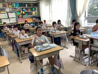 今日は、4のIにおじゃましました。このクラスは、配膳が一通り終わると、給食当番さんの着替えの間に給食係の子が配膳台をきれいにする連携がばっちりできています。素晴らしいね!