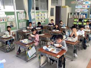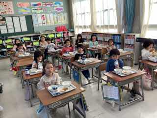 最近は、給食風景の写真を撮るのも慣れてきた一年生です。食器を持って、上手に食べていますね。今日も美味しくいただきました。