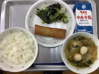 今日のメニューは、春巻き、うずら卵の中華スープ、かふう和えです。一つ一つ手作りの春巻き、美味しいですね〜サクサクした皮ととろみのある餡。豚肉、はねぎ、人参に筍、生姜、たくさんの具材を使っているから美味しいのです!