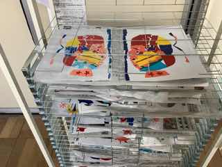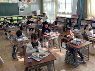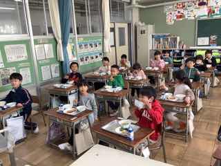 これなら、ゆっくり食べられますね。廊下には、4時間目に刷ったカラー版画が乾かしてありました。今年はカラー版画に挑戦した一年生。形だけでなく、何色を使うか、どれくらいの大きさに色版画紙を切るか、なかなか頭を使ったそうです。