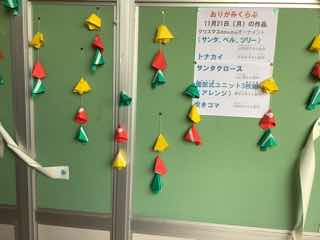 今回作ったサンタクロースの折り方を少しだけアレンジすると、ベルやツリーになるそうです。3階の廊下、折り紙クラブの掲示板に実物がありますよ。