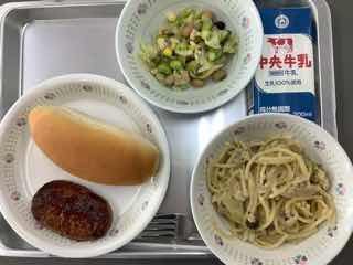 今日のメニューは、スパゲティカルボナーラ、ハンバーグ、まめまめサラダ、小型ロールパンです。スパゲティは、カルボナーラ風ですが、豆乳を上手く使ってコクもあります。とっても美味しい!おまけに、小型ロールパンに、何を挟もうか迷います。スパゲティか、ハンバーグか、子供たちはどうするのでしょうか?