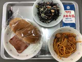 今日のメニューは、ナポリタンスパゲティ、ハムソテー、大豆とひじきのサラダ、米粉パン、コーヒー牛乳です。