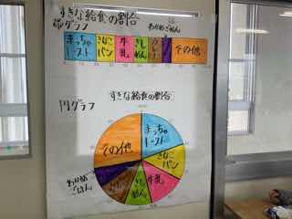 教室のドアには、算数の学習で帯グラフと円グラフを学習し、このクラスの人気の給食メニューの実態がまとめられていました。