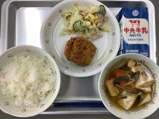 今日のメニューは、さわらの塩こうじ焼き、きゅうりのささみあえ、にくじゃが、ごはん、牛乳です。