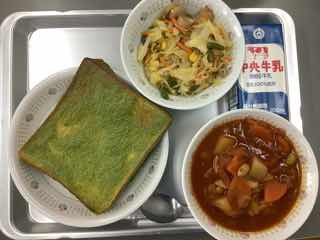 今日のメニューは、抹茶トースト、ポークビーンズ、ウインナーのカラフルソテーです。