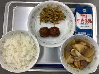 今日のメニューは、カレーきんぴら、野菜の肉だんご、関東煮です。