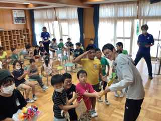 たんぽぽ、さくら、ひまわりのみんなが一つずつ作った物をプレゼントしていました。