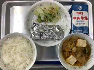 今日のメニューは、ピザトースト、チキンと野菜のスープ、フルーツポンチです。
