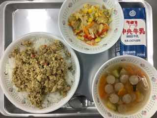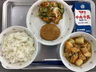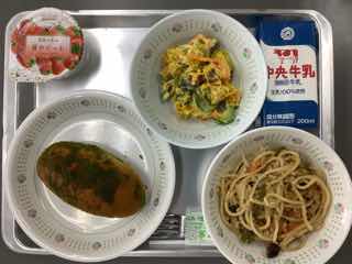 今日のメニューは、抹茶きなこ揚げパン、和風スパゲティ、カボチャとサツマイモのサラダ、いちごゼリーです。