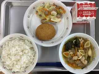 今日のメニューは、マカロニスープ、野菜ソテー、メンチカツです。
