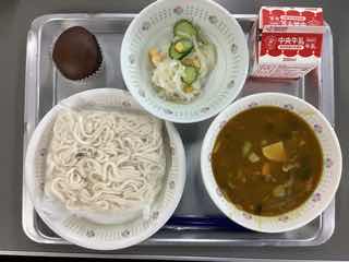 今日のメニューは、カレー南蛮、大根の塩ダレ和え、手作りココアケーキです。
