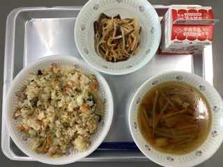 今日の給食は、わかめ飯、さばの照り焼き、千草和え、吉野汁、牛乳です。