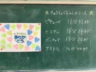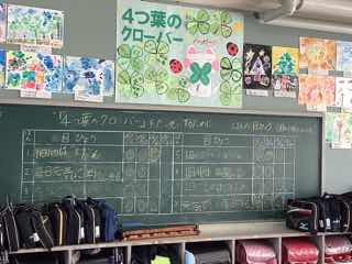背面黒板には、給食準備を早くするためにグループの記録が残されていました。