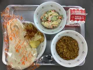 今日のメニューは、3-2リクエスト給食の野菜チップス、キーマカレー、ナン、マカロニサラダです。