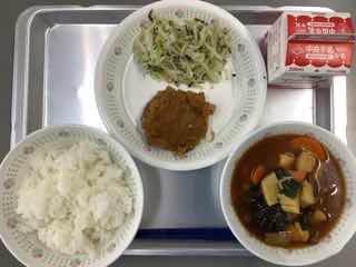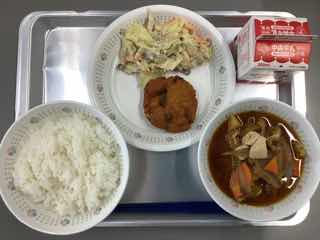 今日のメニューは、五穀ごはん、チキンカレー、コールスローサラダです。ちょっとピリ辛のカレーと、コールスローサラダが絶妙です。