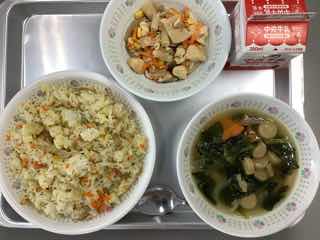 今日のメニューは、にんじんピラフ、鶏肉ときのこのソテー、ウインナーのカレースープです。