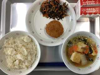 今日のメニューは、ひじきとじゃこのふりかけ、玄米ご飯、ナス入り味噌メンチカツ、みぞれ汁です。
