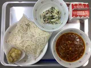 今日のメニューは、ソフト麺ビーンズソース、ほうれん草のサラダ、鬼まんじゅうです。