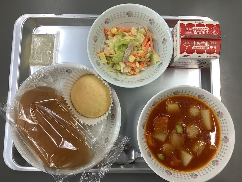 今日のメニューは、米粉パン、肉だんご入りミネストローネ、サウザンサラダ、梨ジャム付きカップケーキです。