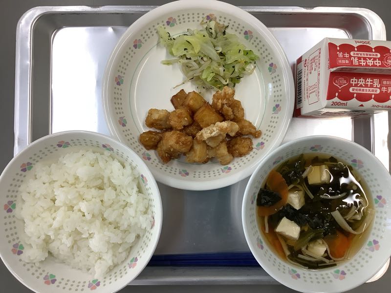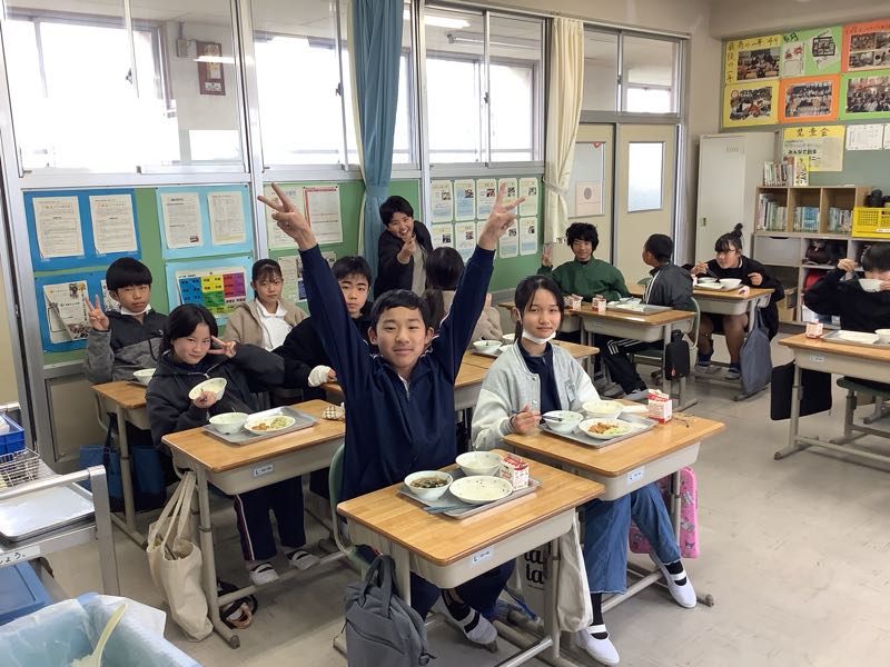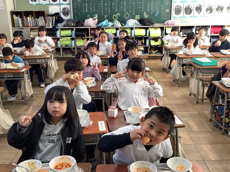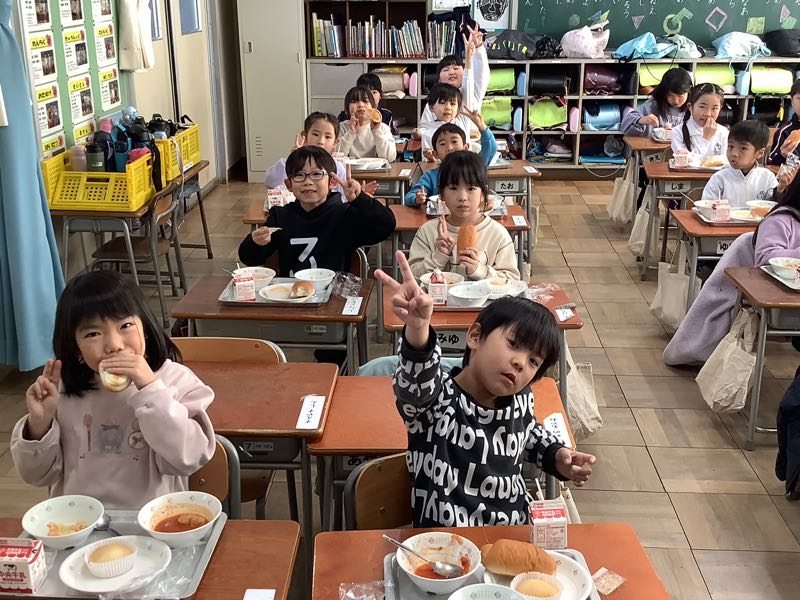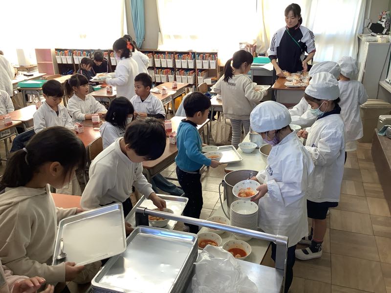 配膳中は、先に配られている梨ジャムが気になるようで、あちこちから「これ、なあに?」「梨ゼリー?」「梨ジャムだって」という声が聞かれました。