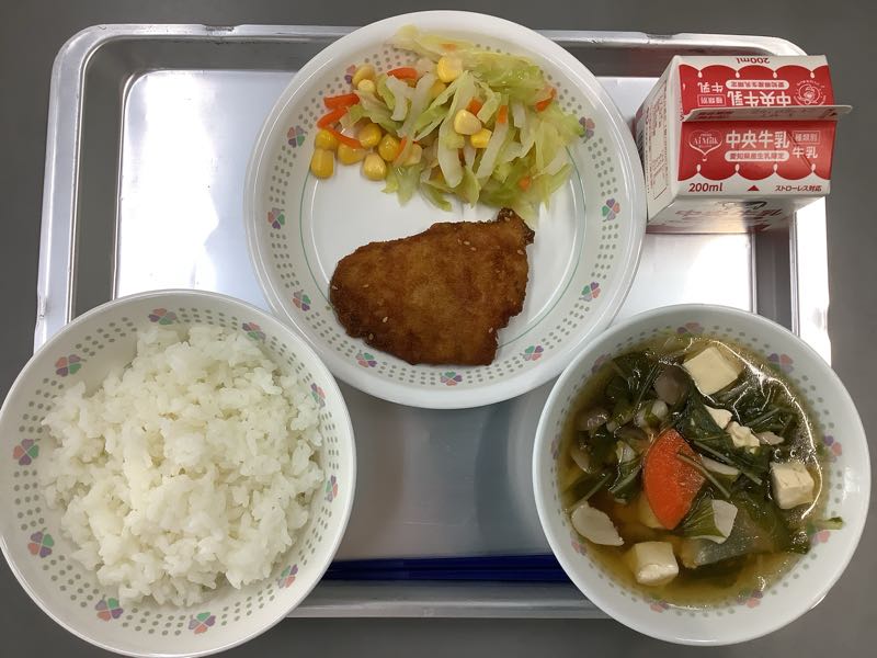 今日のメニューは、カレイフライの甘辛風味、甘酢和え、水菜のはりはり汁です。
