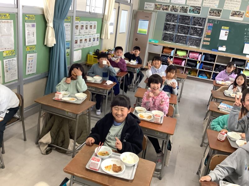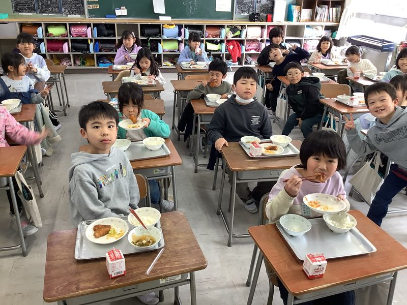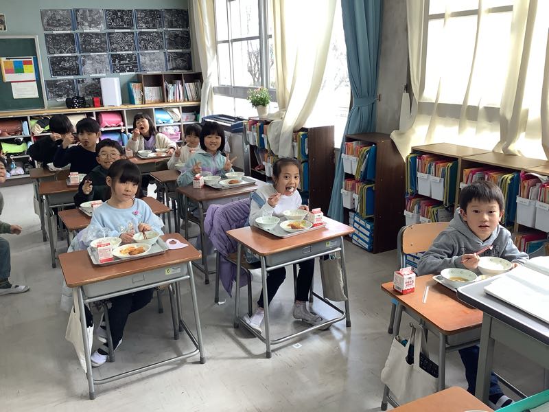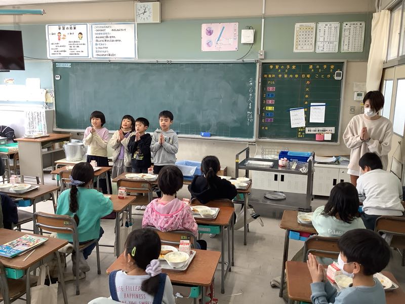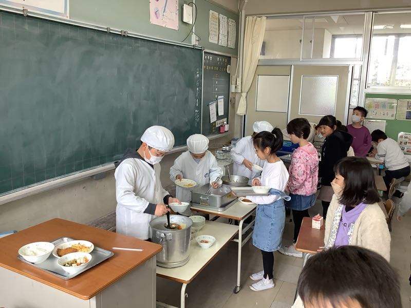 給食当番さんがせっせと盛り付け、給食係さんはみんなに声をかけています。
