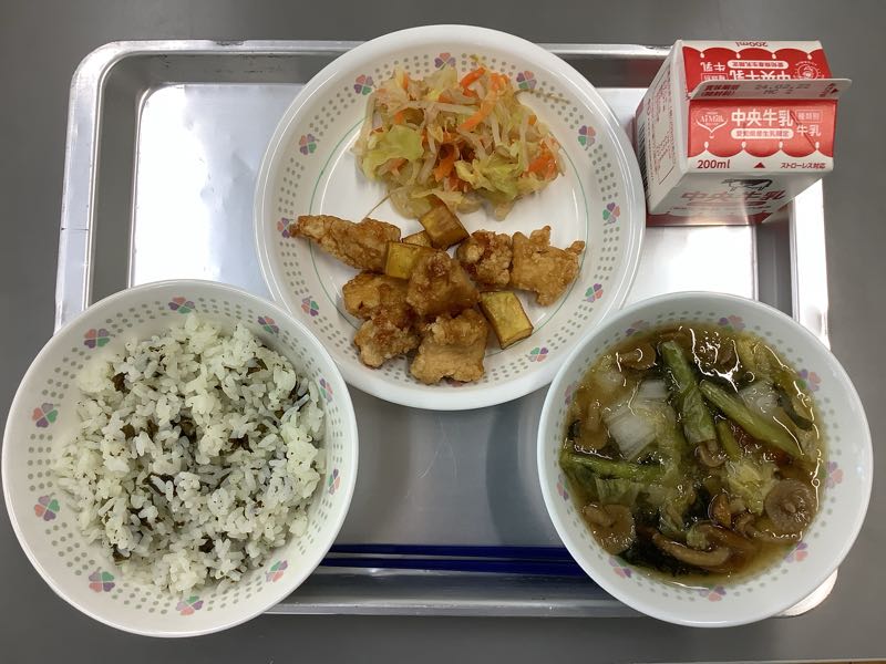 今日のメニューは、鶏肉とサツマイモのからめ煮、ツナ入りおひたし、なめこのおろし汁です。