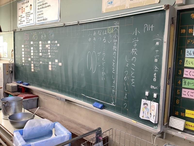 黒板には、国語の板書が残っていて、一年生のまとめの作文に取りかかることが分かりました。