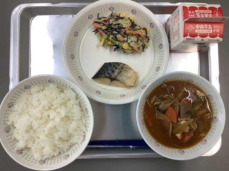 今日のメニューは、サバの塩焼き、ひじきサラダ、豚汁です。サバの塩焼きは、小ぶりでしたが、脂がのっていて美味しいです。箸でするっと身がとれました。ひじきサラダは、マヨネーズで和えていても、さっぱりしています。