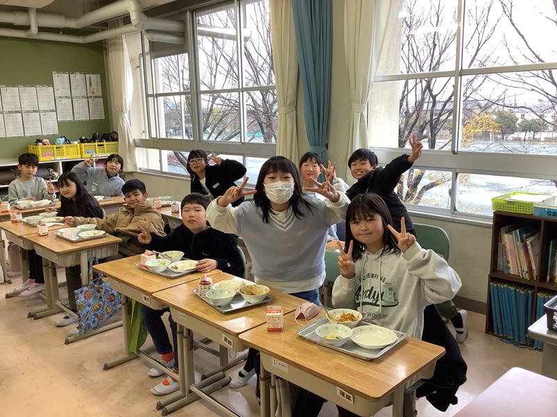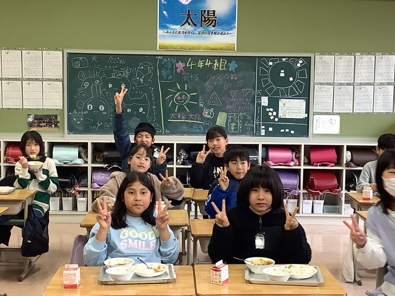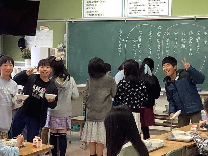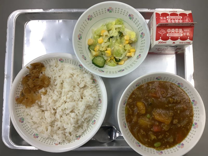 今日のメニューは、カボチャとひき肉のカレー、フレンチサラダ、麦ご飯です。今朝、廊下ですれ違った3年生の子が「今日は、カレーだよ」と教えてくれたので、とても楽しみにしていました。カボチャは、ゴロリと大きめ。でも、柔らかく、甘みもたっぷりです。