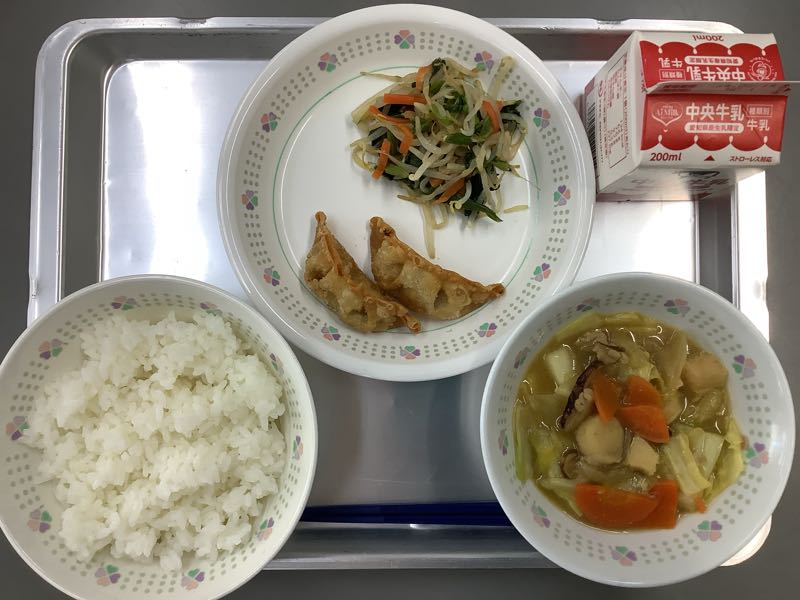 今日のメニューは、北海道ホタテの中華煮、揚げぎょうざ、三色ナムルです。